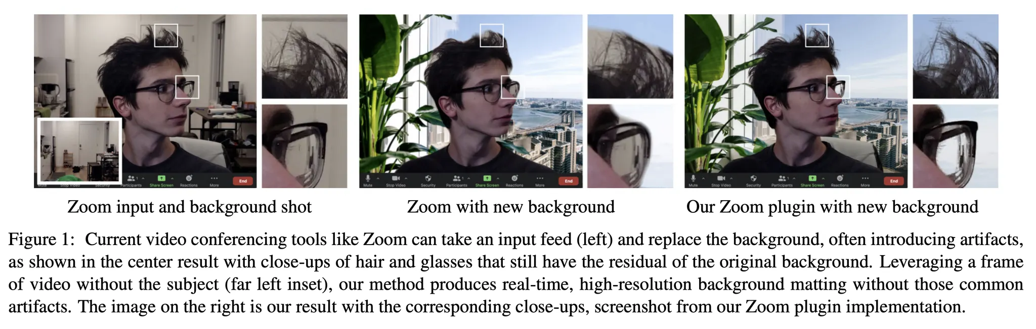 현재 많은 도구가 백그라운드 교체 기능을 제공하지만 경계, 특히 머리카락이나 안경처럼 섬세한 디테일이 있는 영역에서 Artifacts를 생성함.