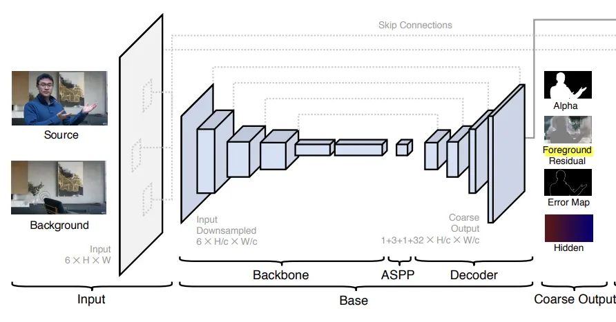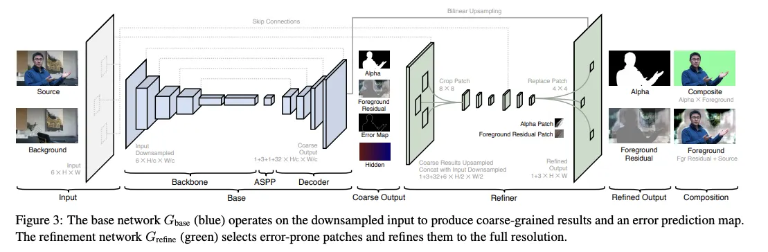 따라서, 고해상도가 필요할 수 있는 영역을 지정하는 오류 예측 맵과 함께 Alpha Matt 및 Foreground 레이어를 Low Resolution으로 예측하는 네트워크를 도입한다.