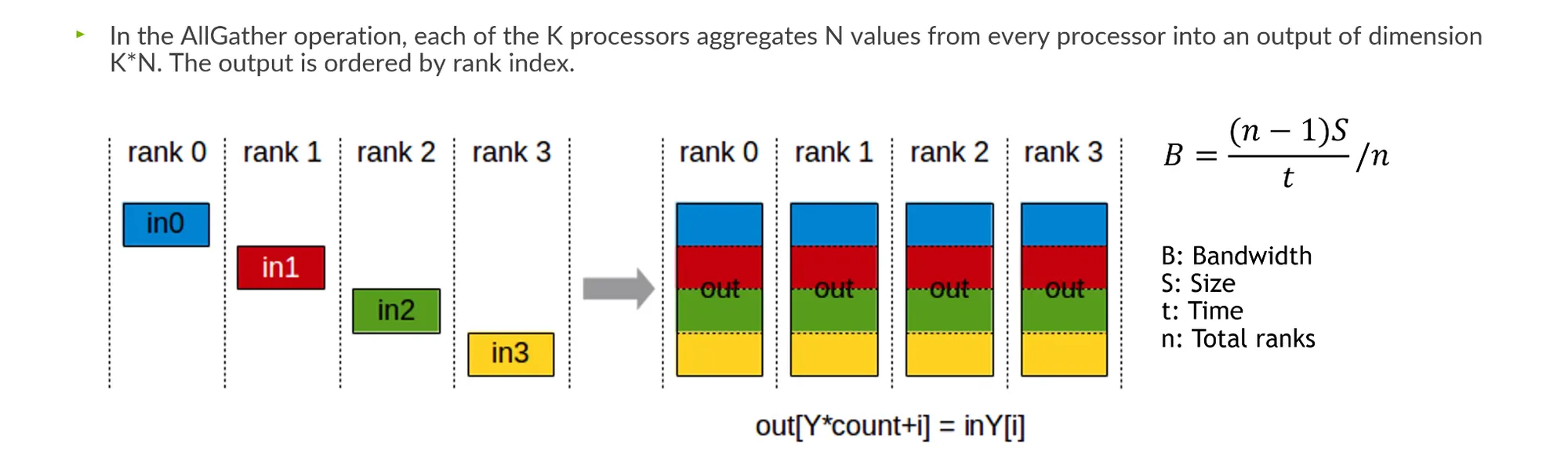 AllGather: 각 rank의 데이터를 하나로 합친 후 다시 broadcast 하는 것.