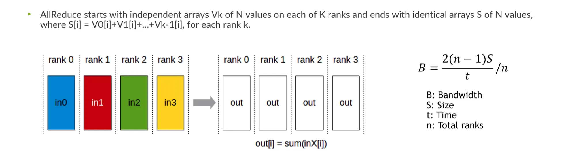 AllReduce: 전반적으로 걸쳐있는 데이터를 summation한 후 broadcast.