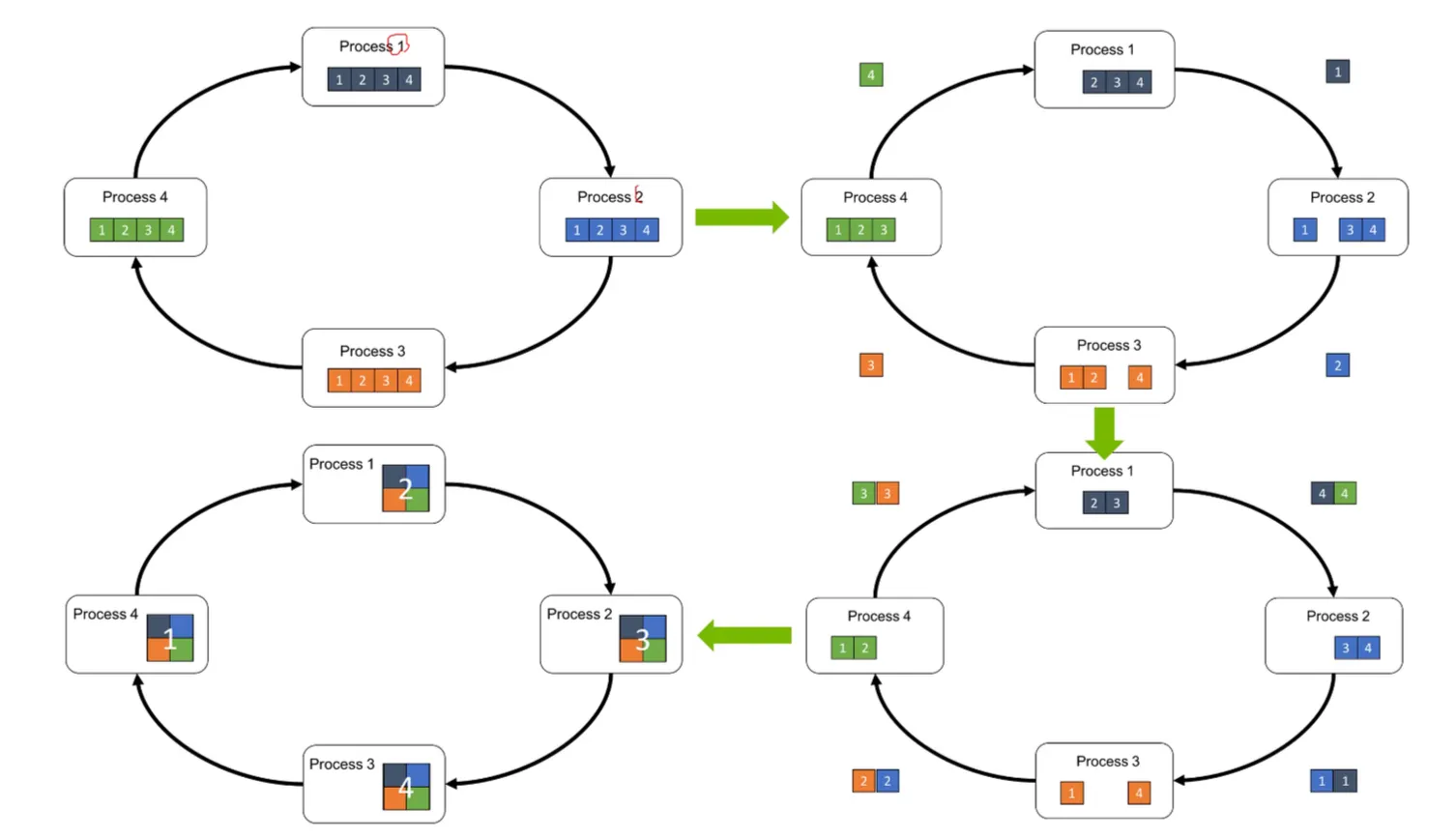 딥러닝 학습 시 이렇게 링으로 구축 후 collective communication을 한다.