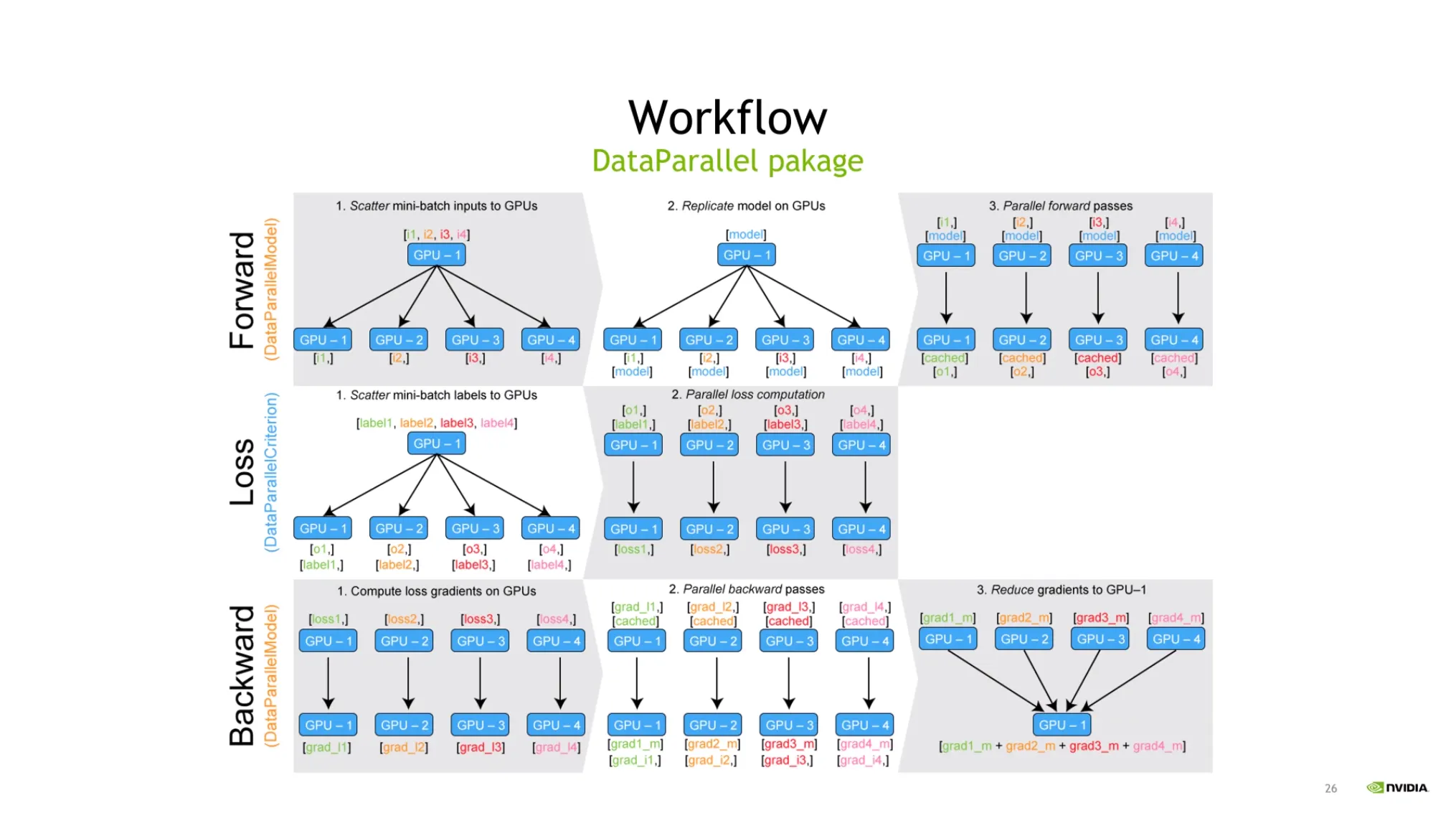 각 GPU에 데이터를 쪼개고, 모델을 복제하고, loss와 gradiant를 계산 후 gradiant를 accumulation 시켜서 weight를 업데이트한다.
