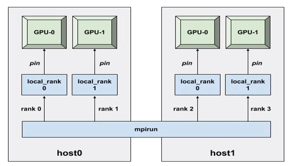 서버 2개 (host0, host1) 안에 GPU 2장씩 있다고 가정하면: