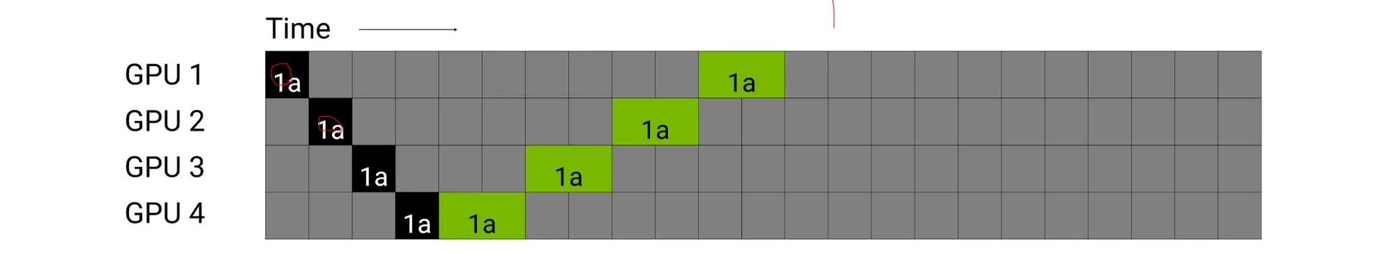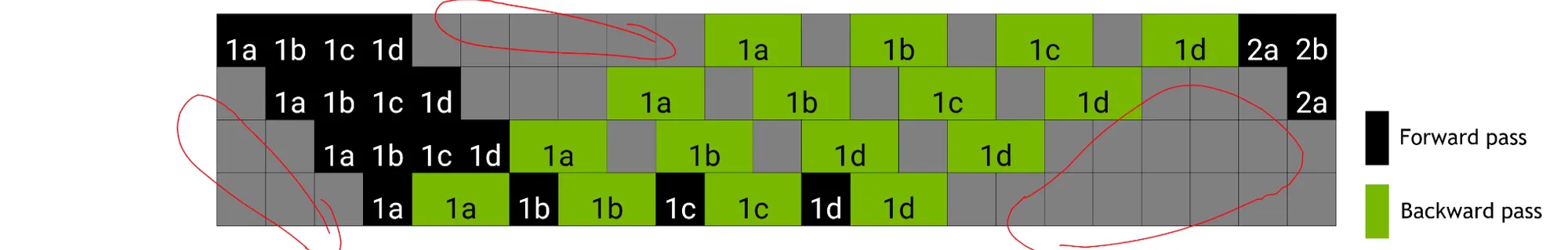 유휴시간을 줄이기 위해, 두번째 micro batch (2b)를 다음과 같이 연산한다.