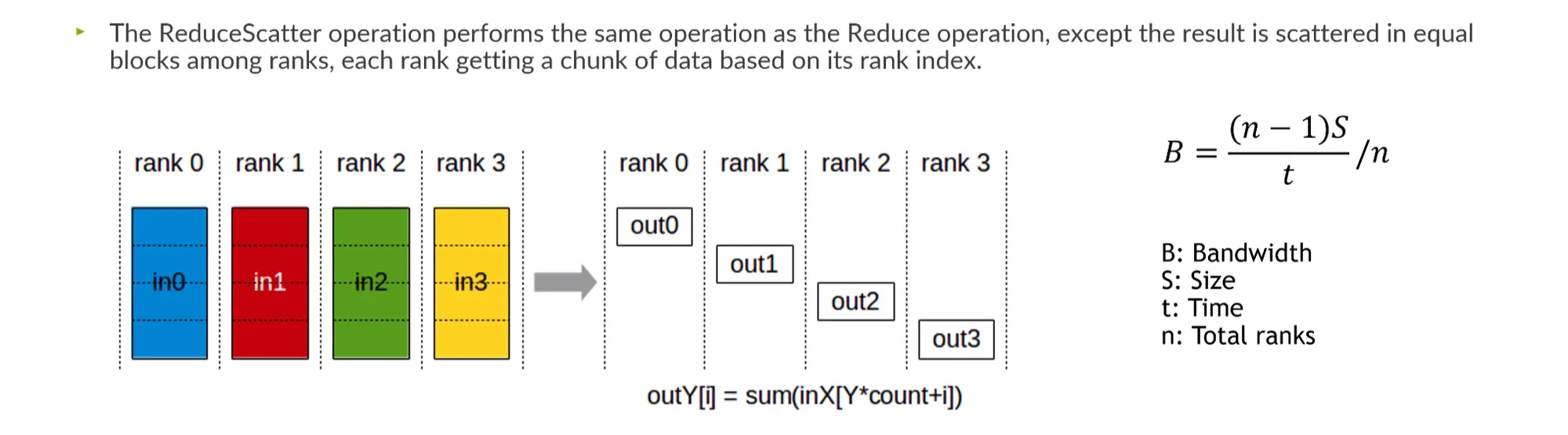 ReduceScatter: 각 위치의 데이터를 rank에 나누어 걸쳐서 전송.