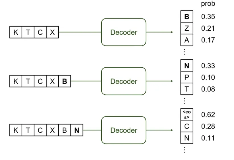 Input token (KTCX)을 Decoder로 feed해서 다음 token을 예측한다. (B)