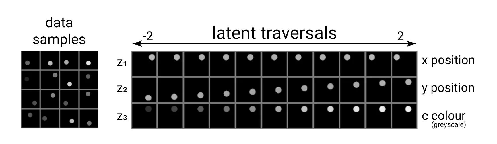 하지만 먼저, 우리는 단순히 의미론적으로 의미가 있는 Latents를 원한다고 말하는 것보다 더 구체적이어야 합니다. 시각적으로 예를 들어 보겠습니다. 2D 평면에 있는 그레이스케일 점들에 대해, 우리는 x, y 위치, 색상을 Latents로 가집니다.