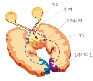 오른쪽 눈 → 좌뇌 (시각교차) → 외측슬상핵 → 시신경방사 → 일차시각피질 → 중뇌 상구