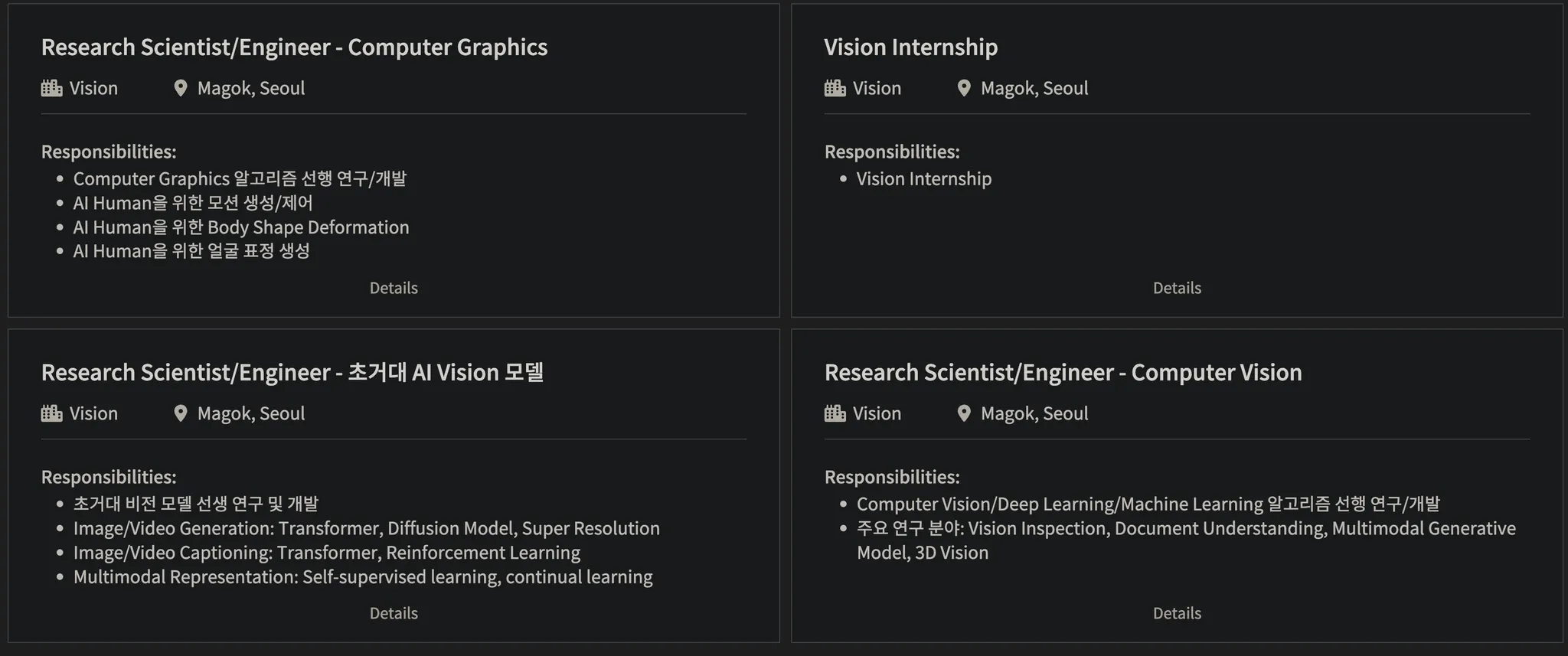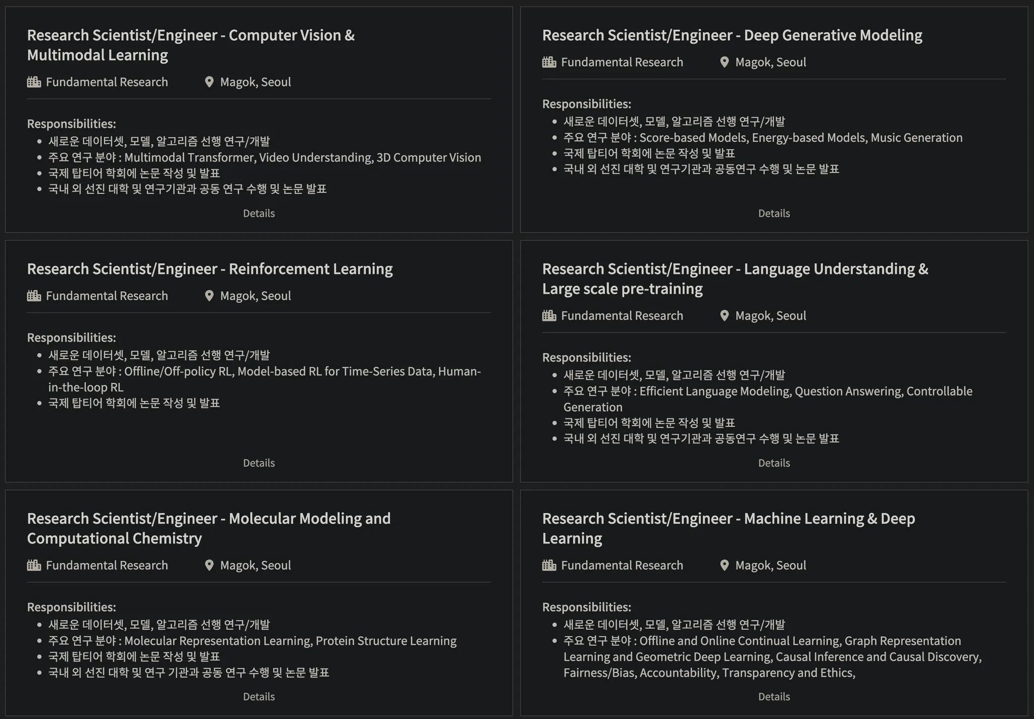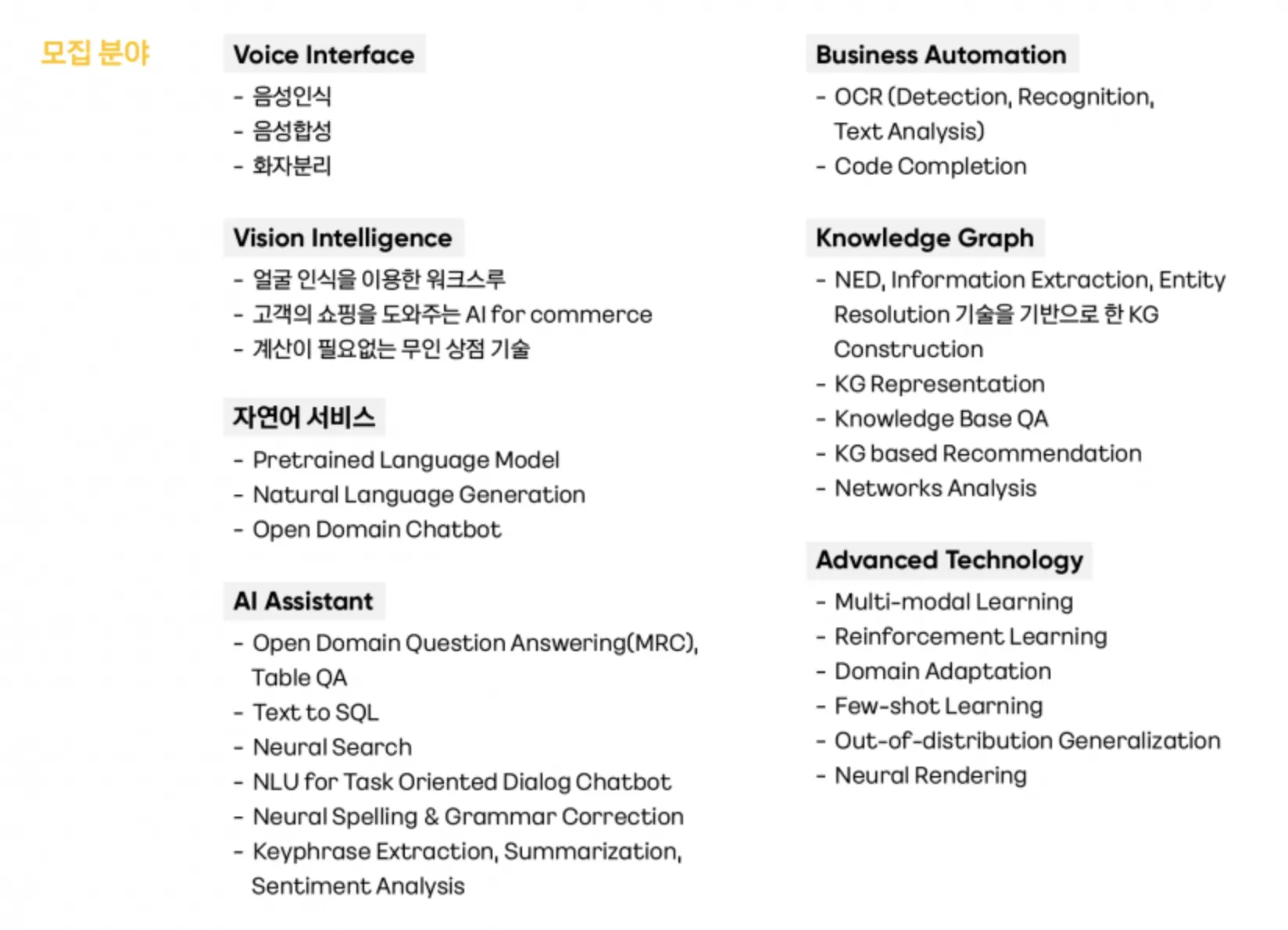 2020년에는 NLP, CV, AutoML 등의 분야에서, 2021년에는 Neural Rendering의 분야에서 채용을 시행한 적이 있었다.