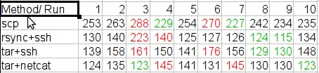 빠른 네트워크에서 tar + ssh가 약간 더 성능이 좋은 것 같습니다. 암호화가 해제된 netcat(ssh에 비해)은 훨씬 더 나은 결과를 제공할 수 있을 것으로 기대합니다.