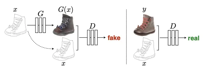 Training a conditional GAN to map edges→photo. The discriminator, D, learns to classify between fake (synthesized by the generator) and real {edge, photo} tuples. The generator, G, learns to fool the discriminator. Unlike an unconditional GAN, both the generator and discriminator observe the input edge map.
