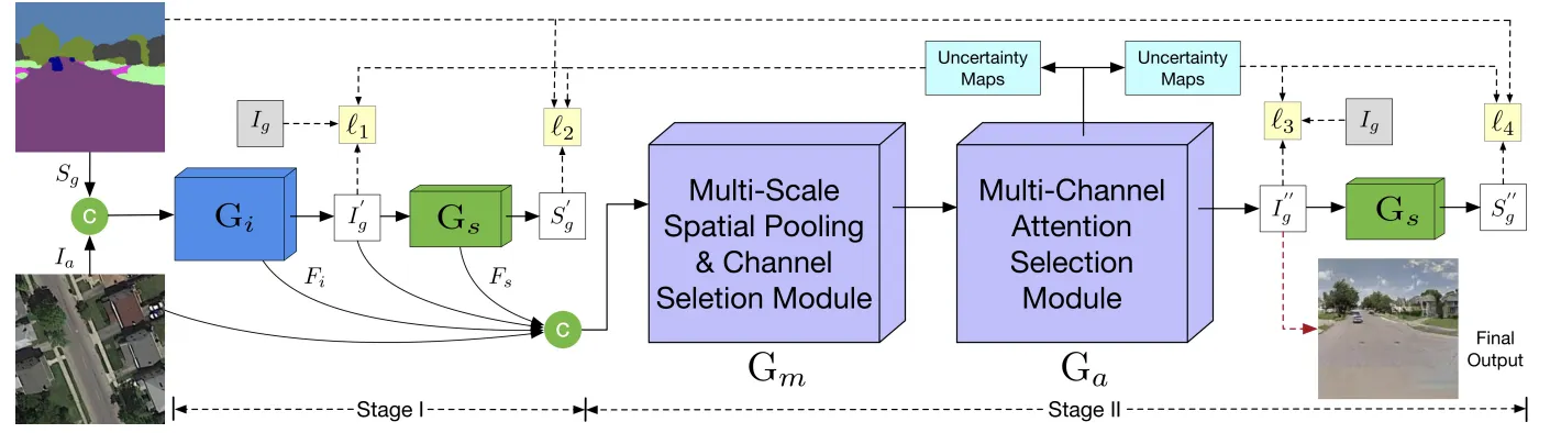 Overview of the proposed SelectionGAN. Stage I presents a cycled semantic-guided generation sub-network which accepts both the input image and the conditional semantic guidance, and simultaneously synthesizes the target images and reconstructs the semantic guidance. Stage II takes the coarse predictions and the learned deep features from stage I, and performs a fine-grained generation using the proposed multi-scale spatial pooling & channel selection and the multi-channel attention selection modules.