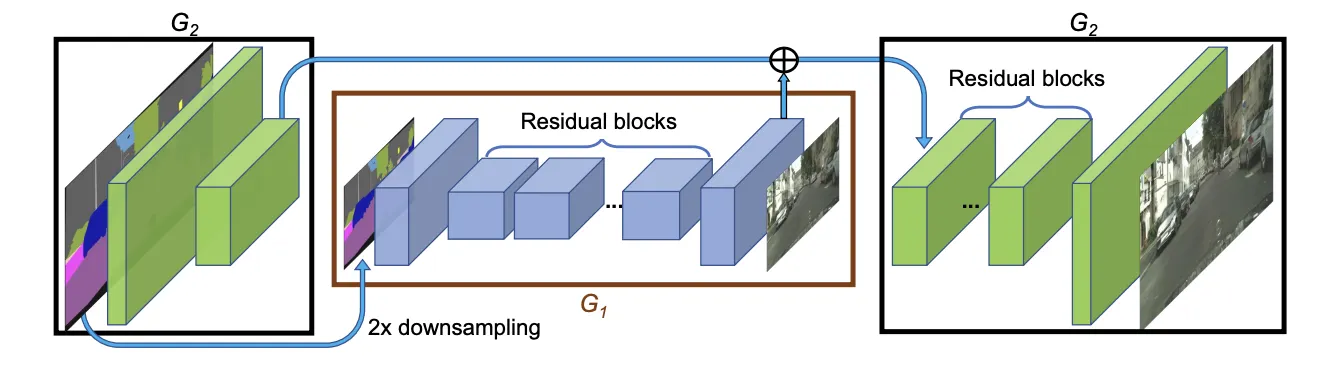 : Network architecture of our generator. We first train a residual network G1 on lower resolution images. Then, another residual network G2 is appended to G1 and the two networks are trained jointly on high resolution images. Specifically, the input to the residual blocks in G2 is the element-wise sum of the feature map from G2 and the last feature map from G1.