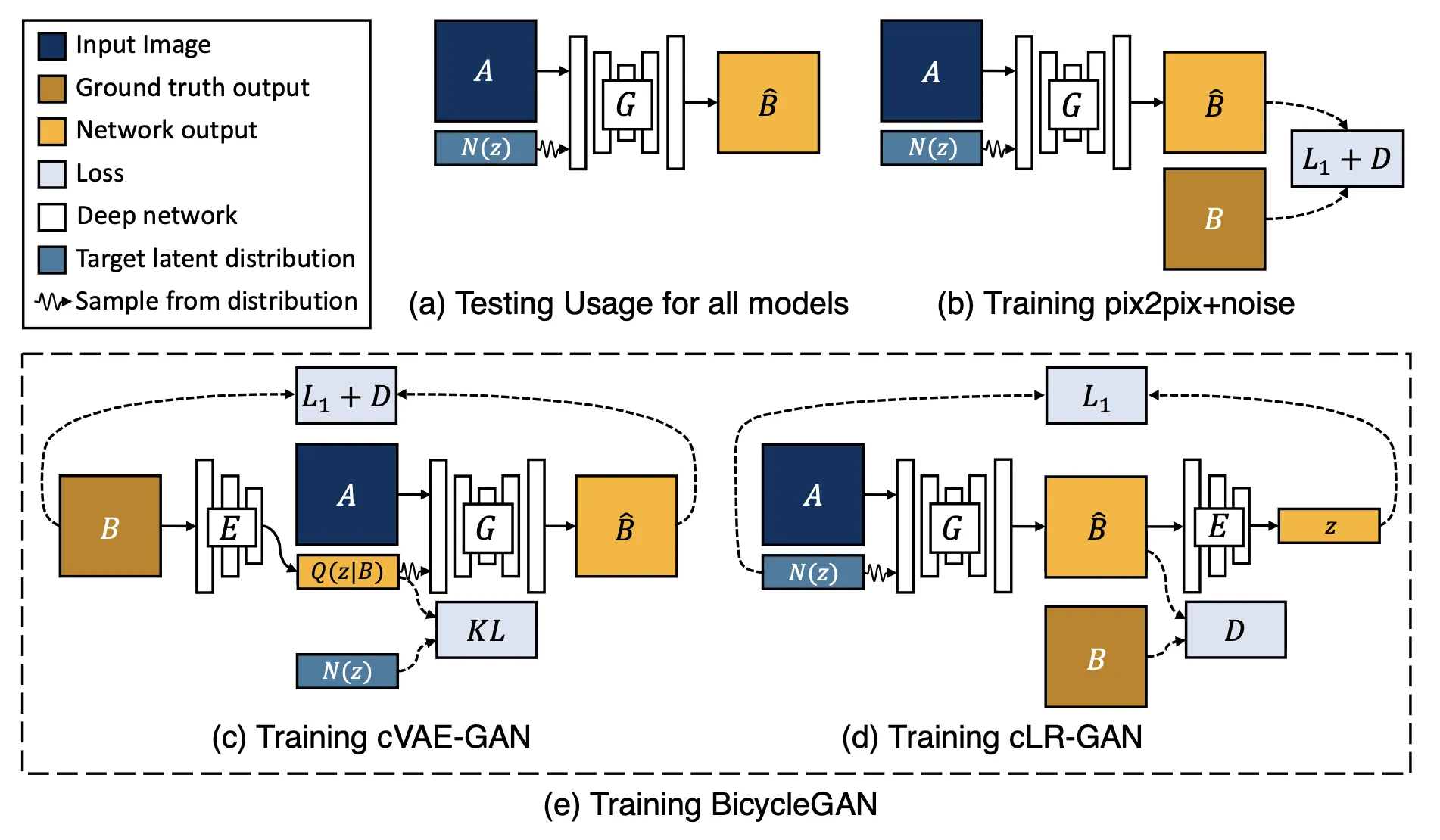 (a) Test time usage of all the methods. To produce a sample output, a latent code z is first randomly sampled from a known distribution (e.g., a standard normal distribution). A generator G maps an input image A (blue) and the latent sample z to produce a output sample Bˆ (yellow). (b) pix2pix+noise [20] baseline, with an additional ground truth image B (brown) that corresponds to A. (c) cVAE-GAN (and cAE-GAN) starts from a ground truth target image B and encode it into the latent space. The generator then attempts to map the input image A along with a sampled z back into the original image B. (d) cLR-GAN randomly samples a latent code from a known distribution, uses it to map A into the output Bˆ, and then tries to reconstruct the latent code from the output. (e) Our hybrid BicycleGAN method combines constraints in both directions.