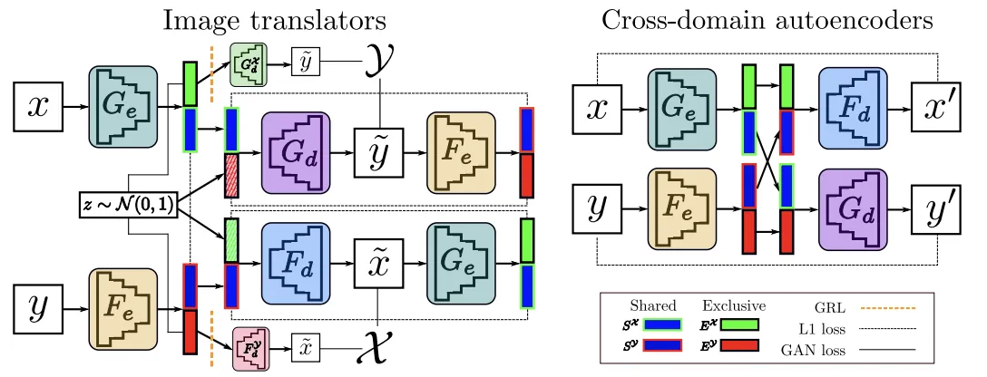 Overview of our model. (Left) Image translation blocks, G and F, based on an encoder-decoder architecture. We enforce representation disentanglement through the combination of several losses and a GRL. (Right) Cross-domain autoencoders help aligning the latent space and impose further disentanglement constraints.