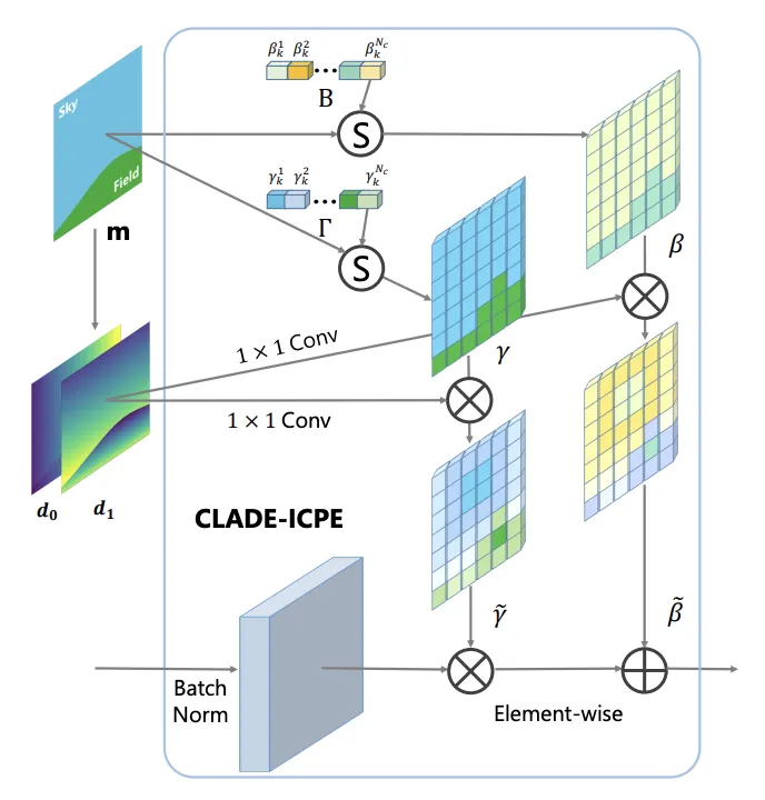 The illustration of class-adaptive normalization layer (CLADE) with intra-class positional encoding (ICPE). The positional encoding map is calculated from the semantic segmentation map. d0 and d1 represent the positional encoding along the x, y dimension.