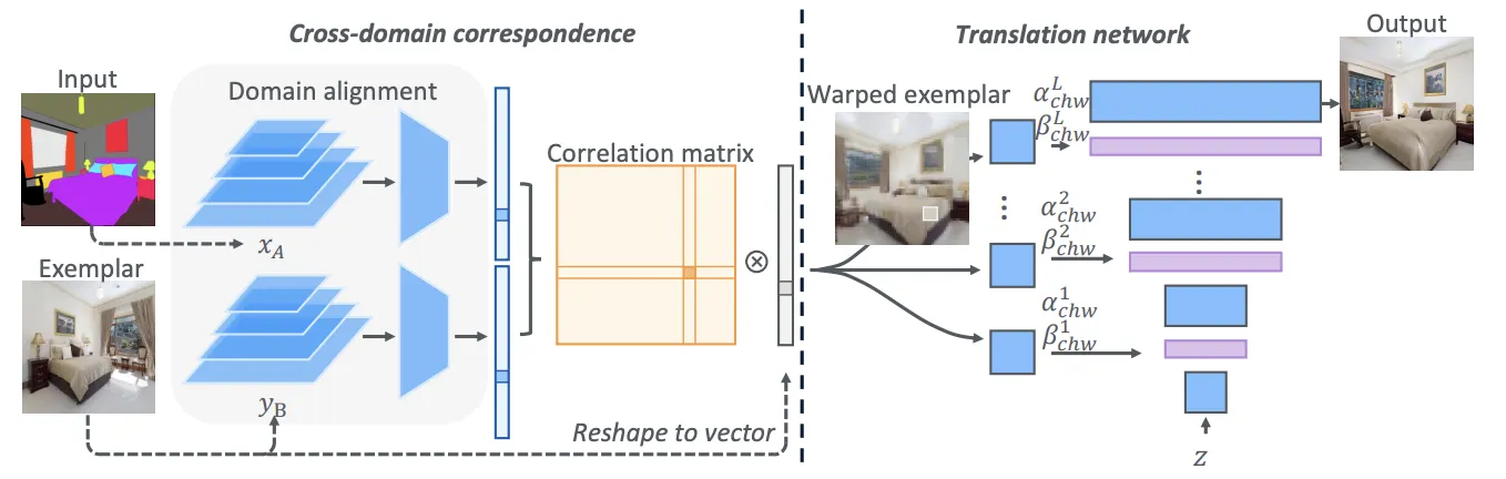 Given the input xA ∈ A and the exemplar yB ∈ B, the correspondence submodule adapts them into the same domain S, where dense correspondence can be established. Then, the translation network generates the final output based on the warped exemplar ry→x according to the correspondence, yielding an exemplar-based translation output.