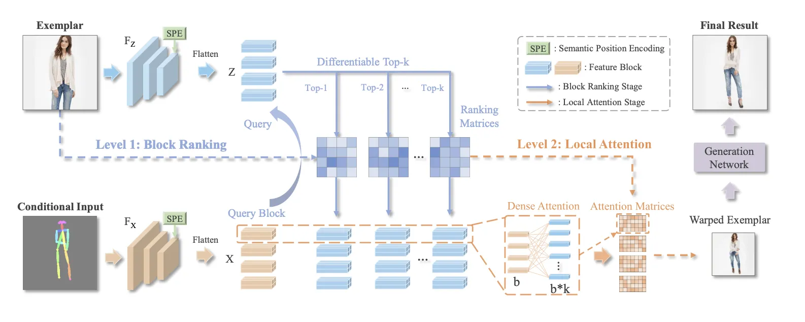 The framework of the proposed RABIT: Conditional Input and Exemplar are fed to feature extractors FX and FZ to extract feature vectors X and Z where b local features form a feature block. In the first level, each block from the conditional input serves as the query to retrieve top-k similar blocks from the exemplar through a differentiable ranking operation. In the second level, Dense Attention is then built between the b features in query block and b ∗ k features in the retrieved blocks. The built Ranking atrices and Attention Matrices are combined to warp the exemplar to be aligned with the conditional input as in Warped Exemplar, which serves as a style guidance to generate the final result through a generation network.
