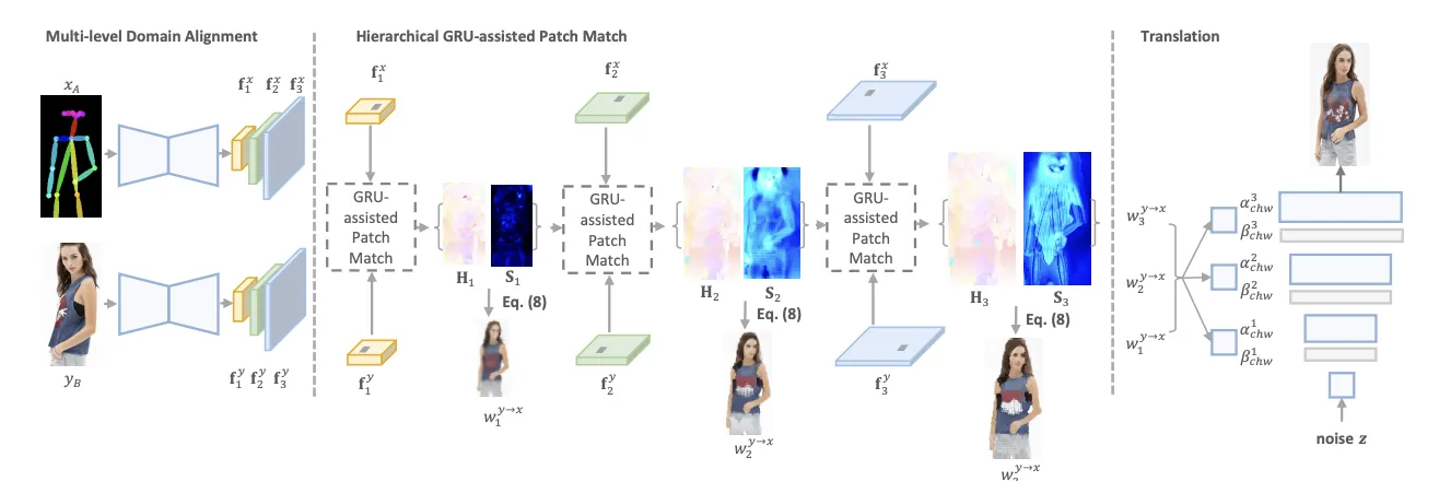 The overall architecture of CoCosNet v2. We learn the cross-domain correspondence in full resolution, by which we warp the exemplar images (w_i^{y→x}) and feed them into the translation network for further rendering. The full-resolution correspondence is learned hierarchically, where the low-resolution result serves as the initialization for the next level. In each level, the correspondence can be efficiently computed via differentiable PatchMatch, followed by ConvGRU for recurrent refinement.