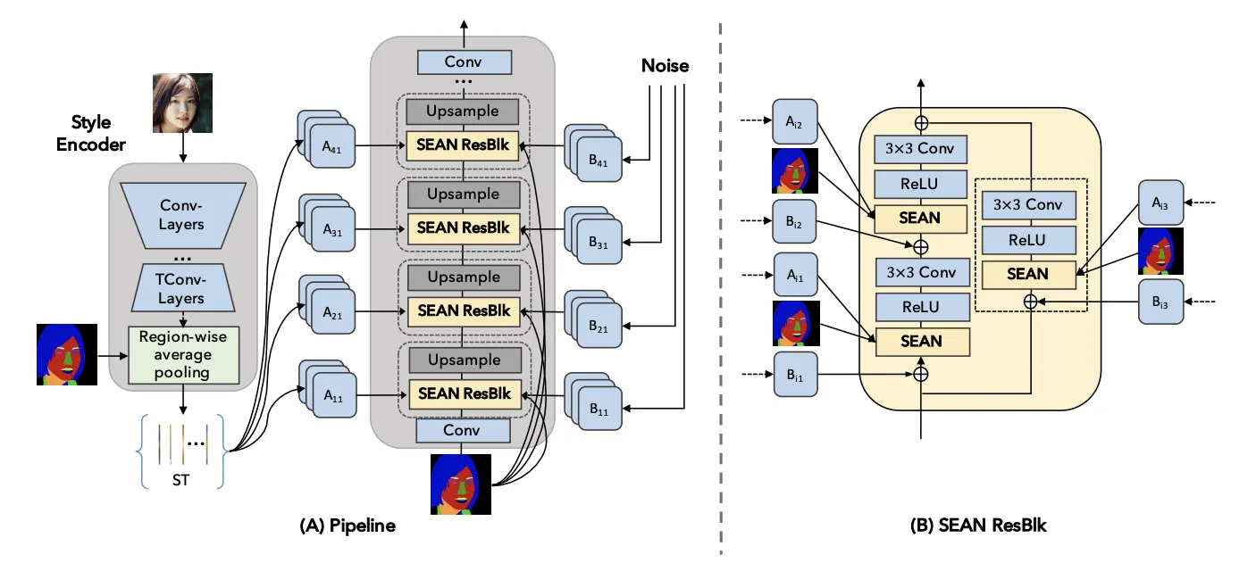 SEAN generator. (A) On the left, the style encoder takes an input image and outputs a style matrix ST. The generator on the right consists of interleaved SEAN ResBlocks and Upsampling layers. (B) A detailed view of a SEAN ResBlock used in (A).
