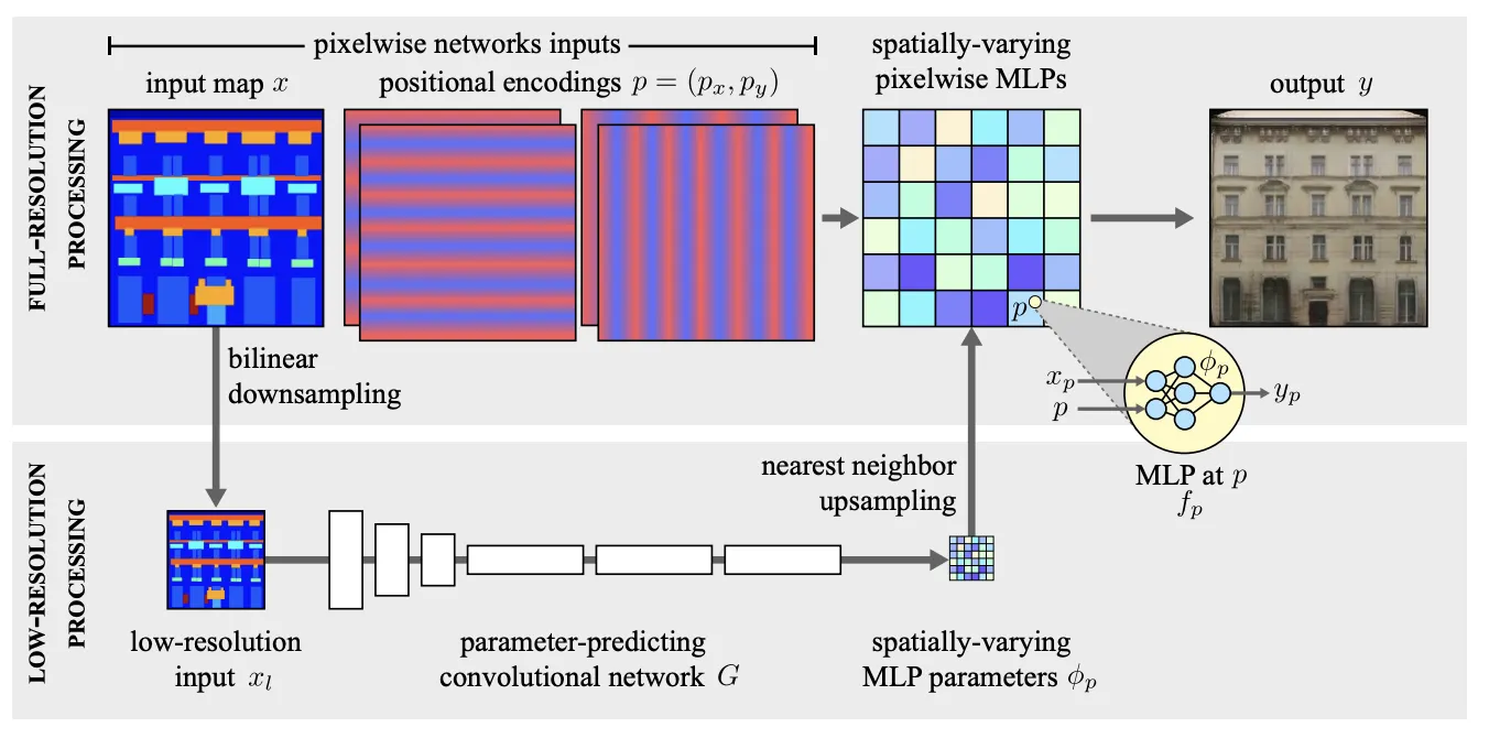 Our model first processes the input at very low-resolution, xl , to produce a tensor of weights and biases φp. These are upsampled back to full-resolution, where they parameterize pixelwise, spatially-varying MLPs fp that compute the final output y from the high-resolution input x. In practice, we found nearest neighbor upsampling to be sufficient, which means that the MLP parameters are in fact piecewise constant.