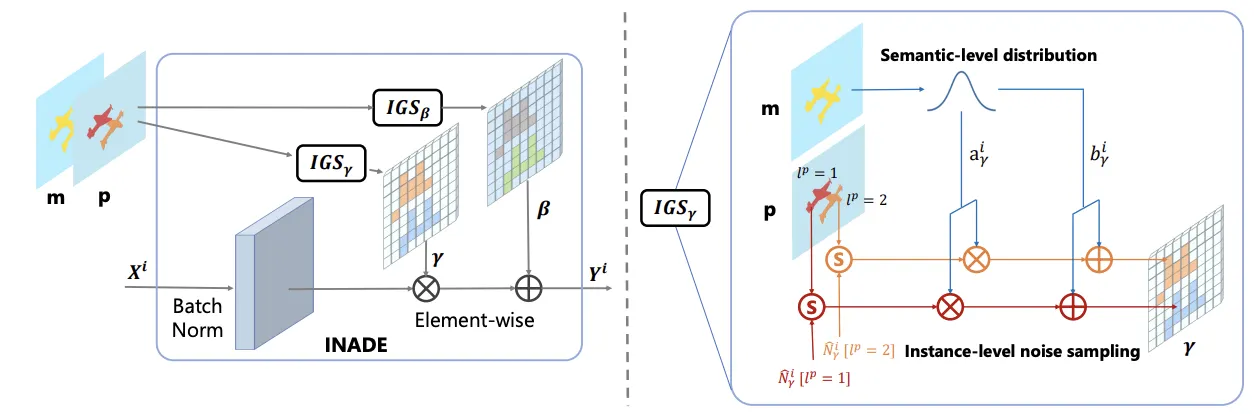The illustration diagram of the proposed INstance-Adaptive DEnormalization (INADE). It combines semantic-level distribution modeling and instance-level noise sampling. IGS denotes the Instance Guided Sampling which is similar to the guided sampling in [37].