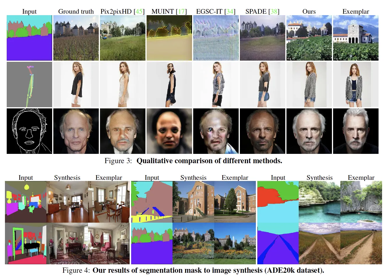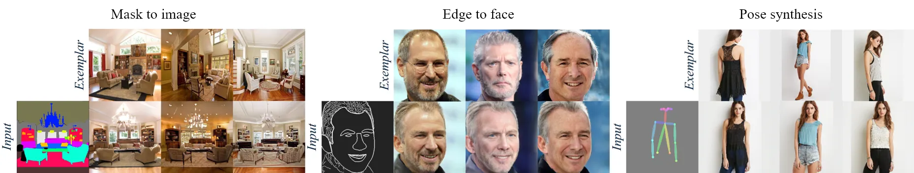 스타일 이미지 (Examplar)와 다양한 종류의 Conditional Input (Semantic map, pose, edge, layout 등)을 이용하여 새로운 이미지를 생성한다.