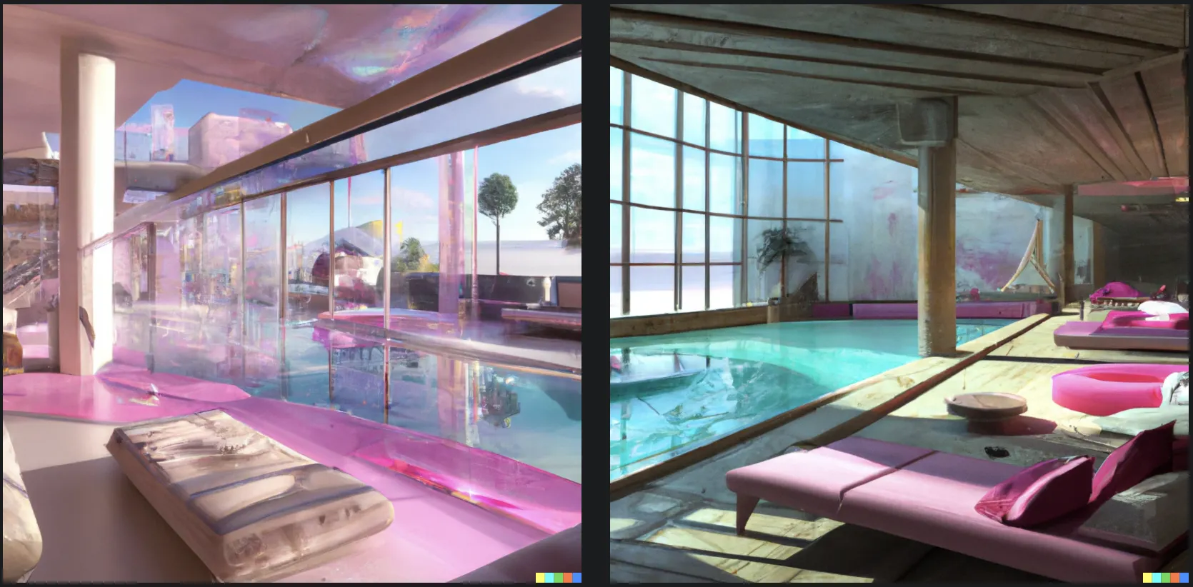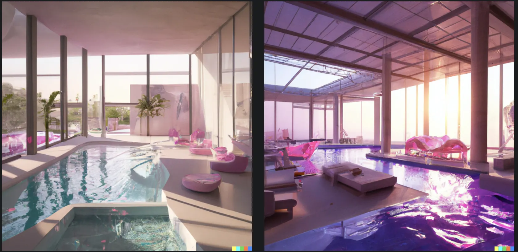A sunlit indoor lounge area with a pool with clear water and another pool with translucent pastel pink water, next to a big window, digital art