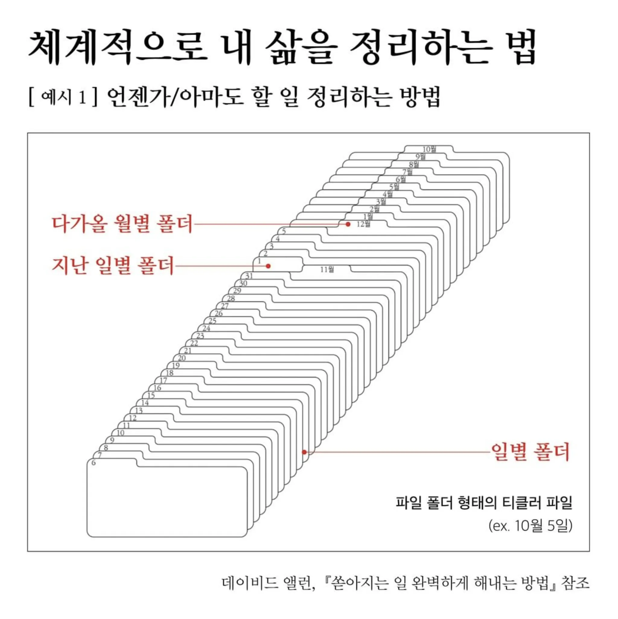 매일 그 날에 해당하는 폴더의 내용물을 수집함으로 옮긴 뒤 빈 폴더는 다음 월별 폴더 뒤에 꽂습니다. (이때는 10월 6일이 아닌 11월 6일을 나타내는 폴더가 됩니다)
