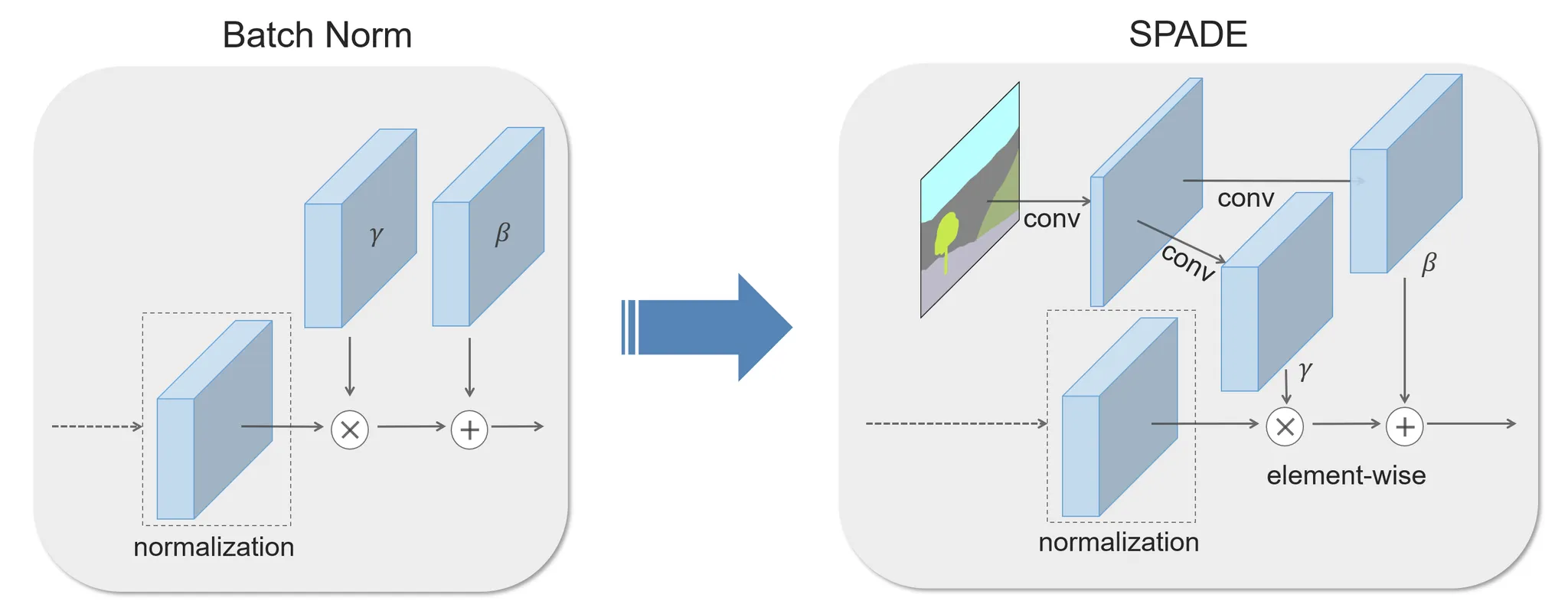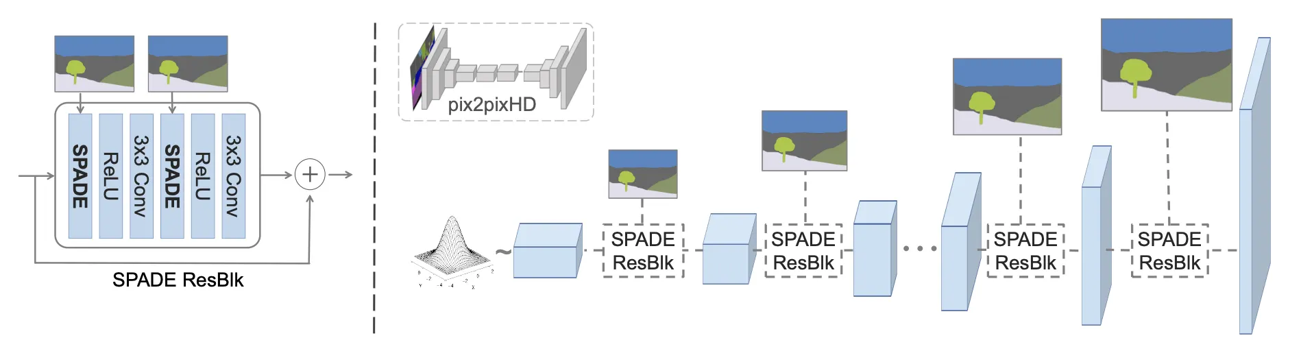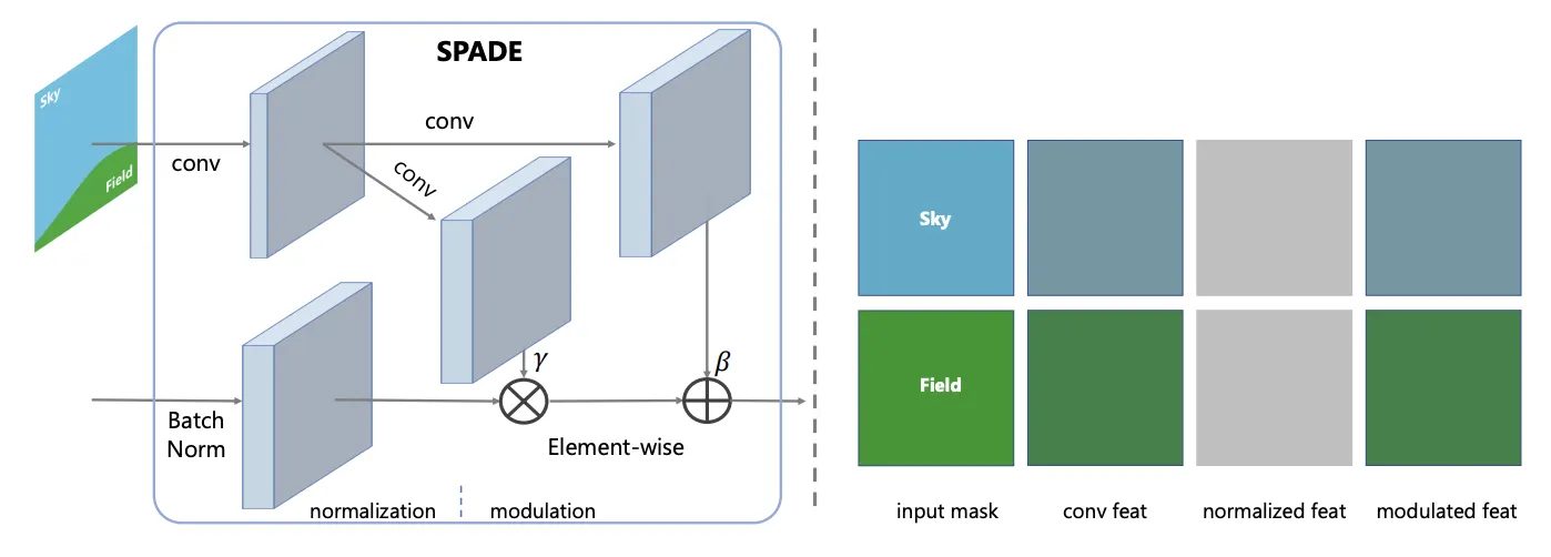 SPADE: 와 를 feature map 의 pixel별로 다르게 적용