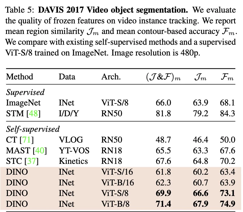 이 결과들은 supervision 없이 얻어졌다고 강조되어 있는 것이 특징입니다. 이 것은 Transformer를 사용한 덕분이고, 모든 attention map의 결과는 사람이 가장 집중하는 사물과 맞아 떨어지는 것을 볼 수 있습니다.