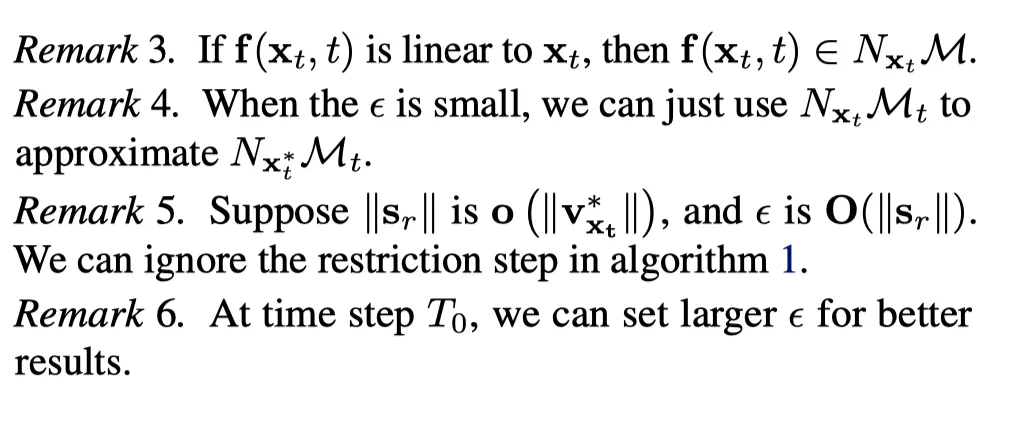 이 Theorem 1은 특정 time step 에서의 매니폴드 접선공간 (tangent space)의 시나리오를 설명한다. 은 매니폴드 상에 제약되어있고, 은 의 접선공간 성분일때, 다음을 만족하는 가 존재한다.