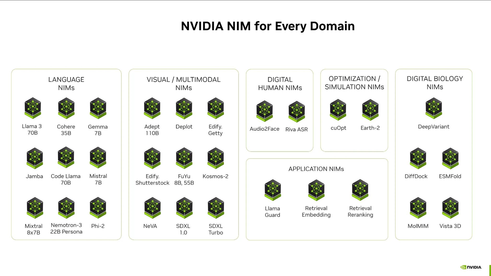 NIM for LLM등 다양한 도메인에 걸쳐서 NIM을 제공하고 있음.