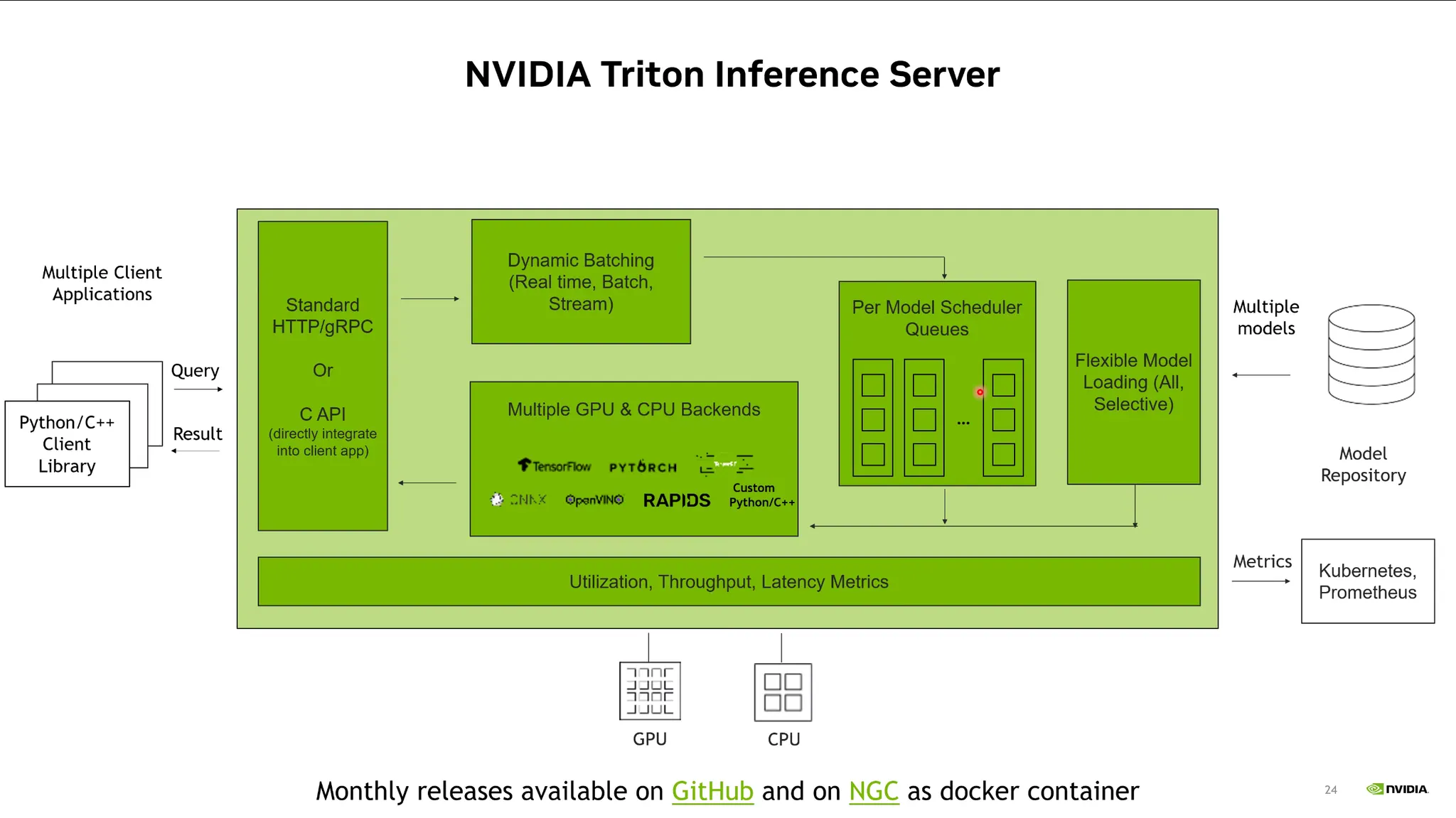 클라이언트에서 query를 HTTP등으로 날려주면, 스케줄러를 통해 적절한 GPU 프로세스에 request를 날리고 응답을 받아줌. 또한 다양한 GPU & CPU Backend를 지원함.