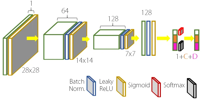 # outputs : 1 (real/fake) + cont_code + dist_code