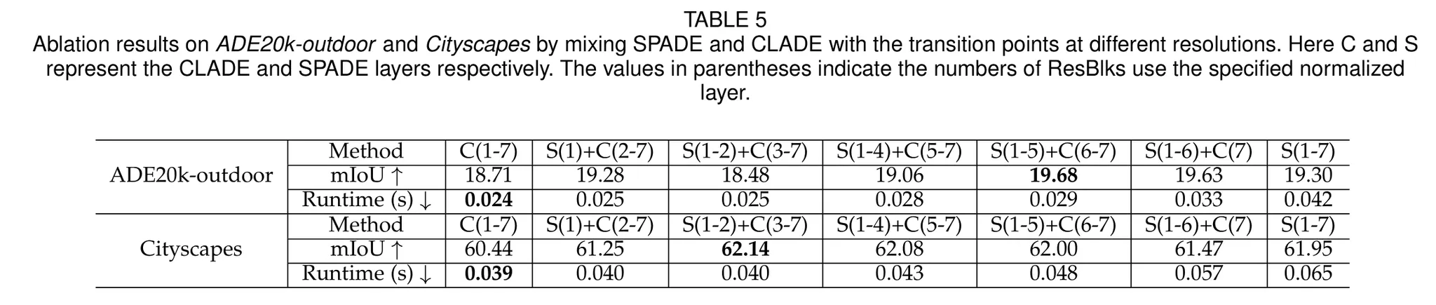 주목할 점은, SPADE에서 고해상도로 갈수록 은 줄어드는 반면 은 128로 고정이기 때문에 overhead가 심하게 나타난다. 이는 연산량의 손해이다. 반면 CLADE에서는 매우 compact한 연산이 가능하다.