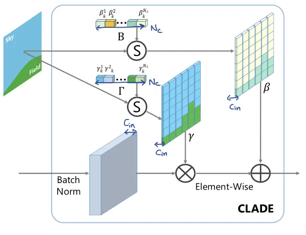 하지만, CLADE는 semantic map을 conv하지 않아 이전 방법처럼 겹쳐서 보내는건 불가능합니다.