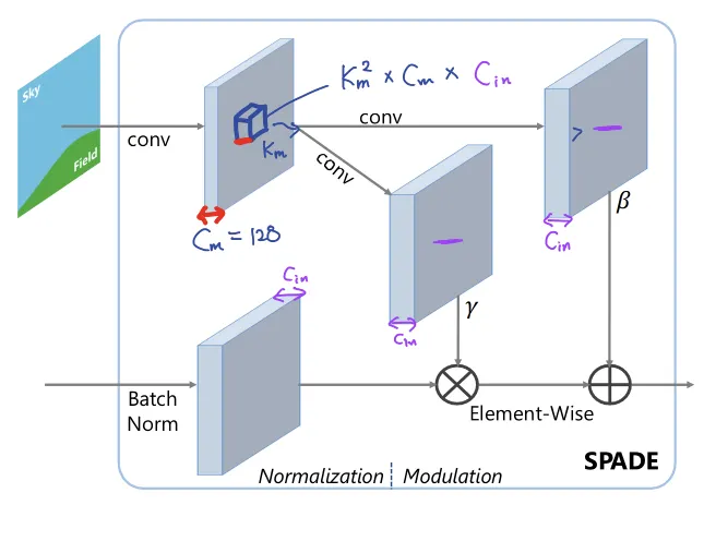 SPADE가 mask를 conv-conv 를 통해 를 구했던 modulation network가 필요없어집니다.
