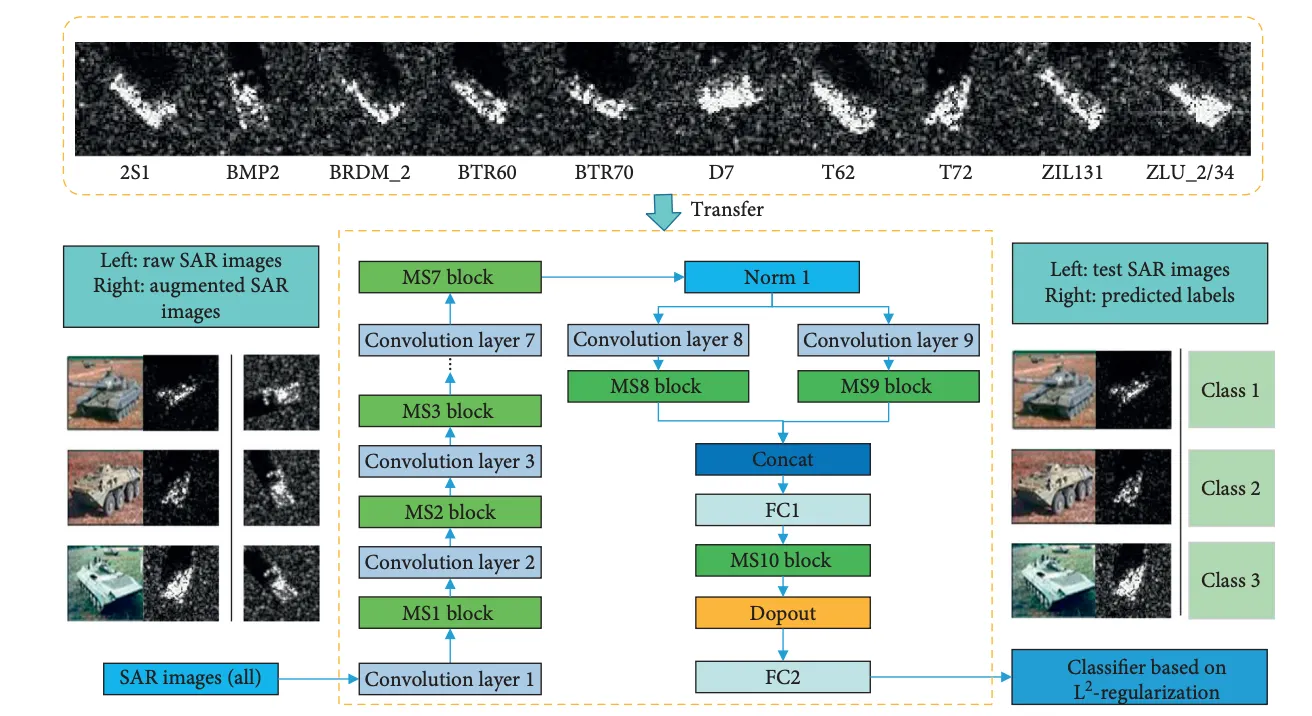 Structure of transferred MS-CNN for SAR target recognition. Firstly, raw SAR images and transformed SAR images is utilized in MS-CNN to extract information, and the extracted features are by normalization operation to preprocess the learned features. -en, the learned features are transformed to Max-Slice block; and the obtained feature maps are scaled to different size and operated with feature aggregation; meanwhile, the processed feature maps are merged and associated with each specified size. -irdly, various filters are utilized to obtain the feature information and max-pooling is served to enforce the robustness of the features. -e fully connected high-level feature layer and softmax layer predict the recognized classes. Finally, parameters from outside datasets are transferred to the target classification