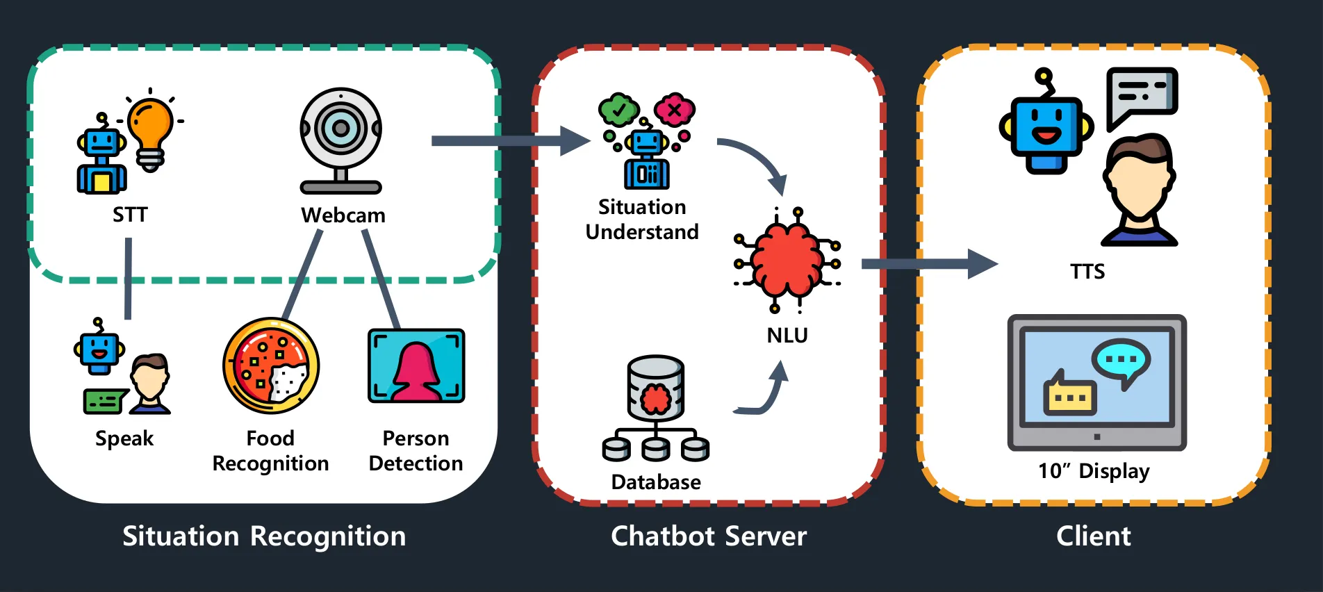 노인의 위치 및 저녁식사 음식 종류등을 인지하여 노인에게 알맞는 식단 및 영양 정보를 제공하고 노인에게 말벗이 되어줍니다.